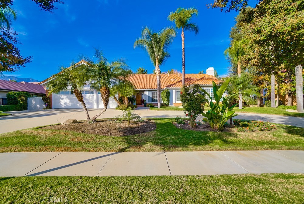Elegant single level home with just under 3,100 sq. ft. of living space, on approx ½ acre of lushly landscaped grounds. Enter to find soaring cathedral ceilings, Solid Ash, scraped wood floors, plantation shutters, an expanse of towering windows and french doors, formal living and dining rooms with fireplace, and a breathtaking view of the park like back yard and mountains. For the gourmet cook, this gorgeous new custom kitchen w/ gleaming Carrera marble counters and a massive center island, eat in kitchen, and bar seating for 6+ guests is an entertainers delight. This wonderful space opens to a warmly appointed family room centered around the large brick fireplace. The private master suite is the entire west wing. Includes double door entry w/ glass transom, French doors leading to back yard, relaxing master bath with soaking tub and large glass enclosed shower, dual sinks and generous marble vanity as well as 2 walk-in closets. There are three additional spacious bedrooms, plus one used as a den with no closet. laundry rm with extra storage, sink and plenty of counter space leads to three car garage w/ custom cabinets and flooring. Sprawling backyard has large lawn area, pond, trellis covered patio, fruit trees, bubbling spa, and an amazing detached structure used as additional living space, with an entire wall of glass doors, that allows the outdoors in. There is also a charming play house/retreat & gated RV parking to complete this picture perfect home.