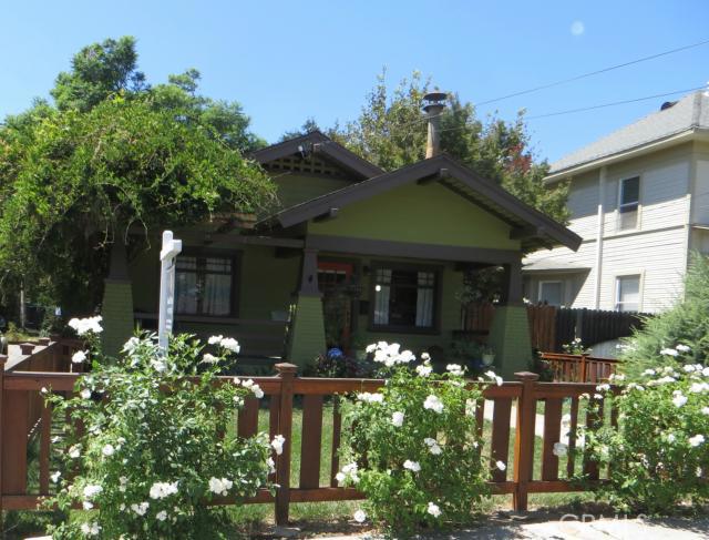 Charming Craftsman Bungalow in move in condition near down town Upland and the Pacific Electric Bike Trail! This home is newly painted inside and out and boasts a newly remodeled kitchen with black granite counter tops and vintage style original cabinets. The home has wood flooring, the living room features a fireplace, prairie windows, and posts with built ins that divide it from the formal dining room. The bathroom has been remodeled with custom wood cabinets, true to Craftsman form and has marble counters. Two large bedrooms provide ample space, and the mud room houses the washer/dryer, storage space, walk in pantry and space for hanging coats etc... To finish, the front yard has built in automatic sprinklers, a lovely craftsman style wood fence, and there is a spacious very private back yard with mature fruit and flowering trees, a vegetable garden, and lots of lawn for play or relaxation. This is a rare find, and a must see!