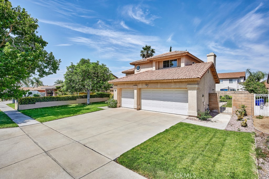 Beautifully upgraded home, on quiet Fontana street. This lovely property has two story ceilings, a dramatic curved staircase in entry, fresh neutral paint and designer carpeting, stunning wood laminate flooring, and so much more. The formal living and dining rooms are sure to impress, and the chefs kitchen with gleaming tile counter tops and walk in pantry, as well as bar seating and adjacent family room with warm fireplace, are perfect for entertaining. The down stairs bedroom and full bath, as well as a separate laundry room, add to the features! The second level boasts the private master retreat, complete with the en-suite that has a double sink vanity, large oval soaking tub and separate shower, and an oversized walk in closet. There are two additional bedrooms and full bath that complete the upper level. The backyard is perfect for visiting with friends, or quiet relaxation, with the lush lawns and mature foliage, block wall fencing and covered patio. With so many features and upgrades, This home is move in ready and an absolute must see!